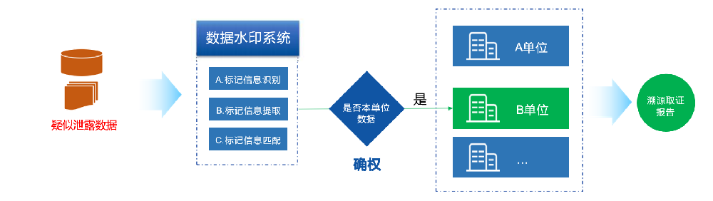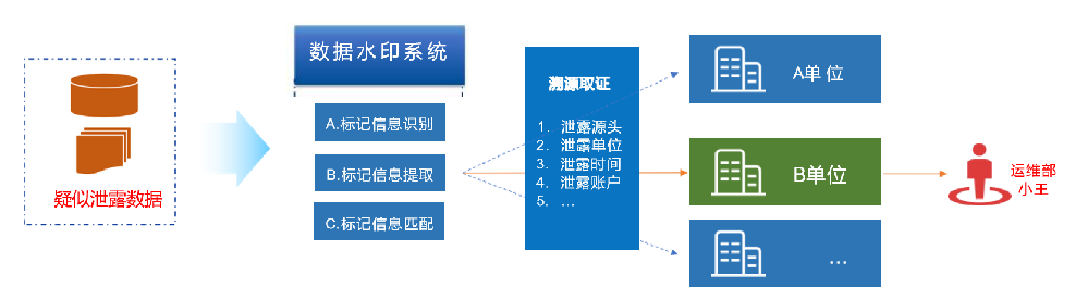 如出现数据泄露可通过泄露数据样本进行溯源追责,包括数据分发对象 、分发单位 、分发时间等信息 ,实现数据泄露后的溯源追责,降低数据使用的安全隐患,提高对数据安全管理意识。